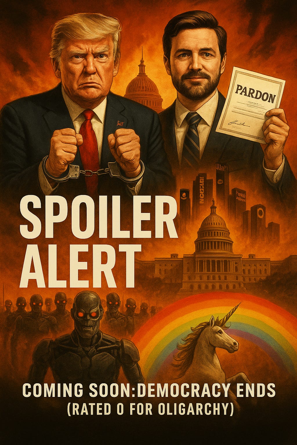 He’s installed as President—like that wasn’t the plan all along. He smiles, looks vaguely “statesmanlike,” and his first act? Pardon Trump. Full exoneration—instantly shattering what little public faith remained in politics or the democratic process. Because now it’s glaringly obvious: every so-called “democratically elected” government is just a heinous, corrupt racket built on malfeasance, theft, manipulation of public opinion, and good old-fashioned subjugation.